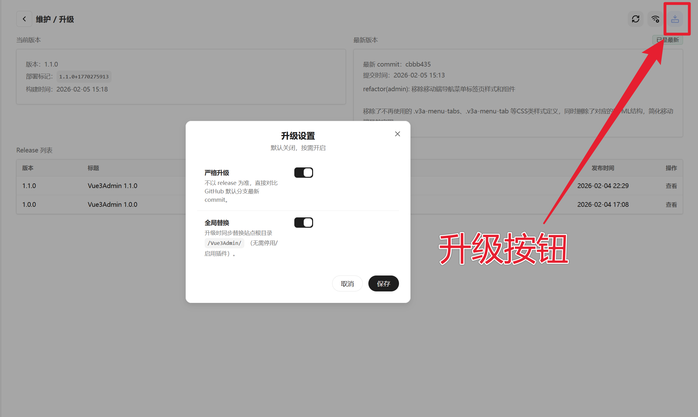 在后台面板的左侧栏中,底部维护下拉菜单有升级页面,点击进入,右上角的蓝色下载图标按钮就是升级按钮。